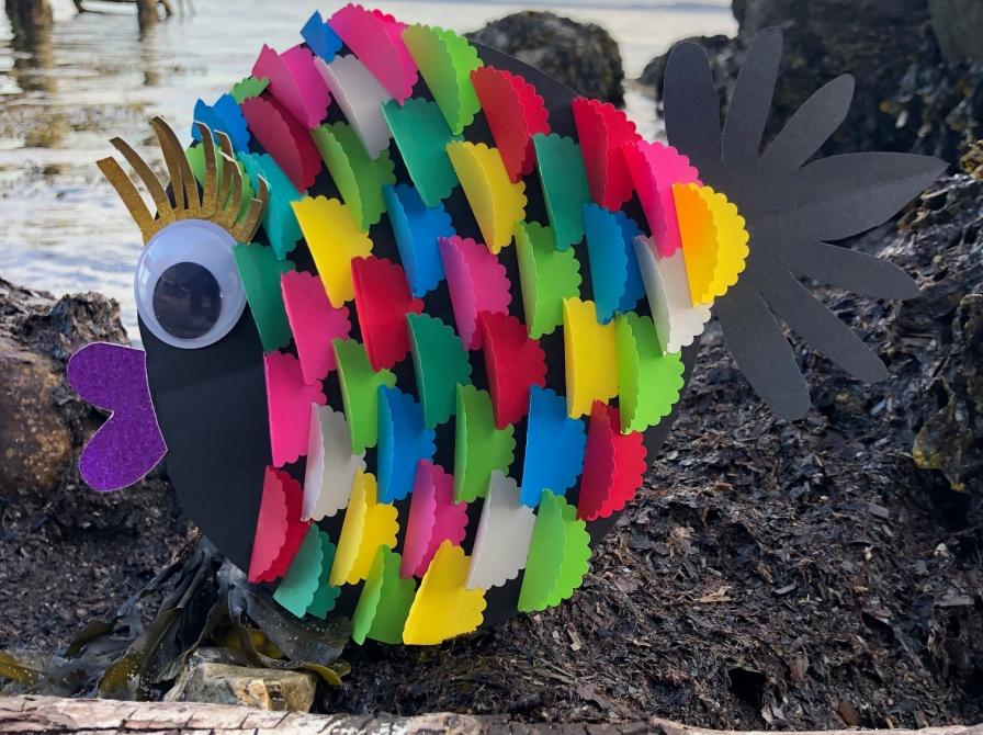 Vi klipper flotte, farvestrålende fisk, som enten kan tages med hjem eller blive en del af en større stime, der udstilles på biblioteket.